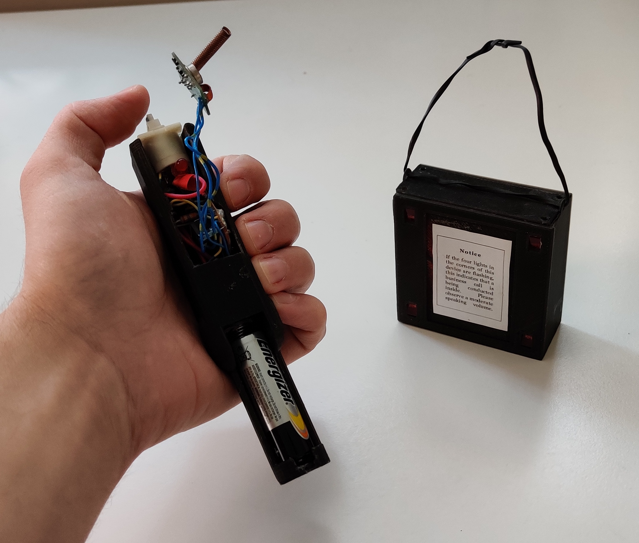 A single AA battery does not have a very high impedance, and this is evident in the Chaos Device when, after days of use and with the battery beginning to go flat, the pitch of the activation and deactivation sounds starts to droop and squawk like a broken robot. This amusing malfunction occurs because:
