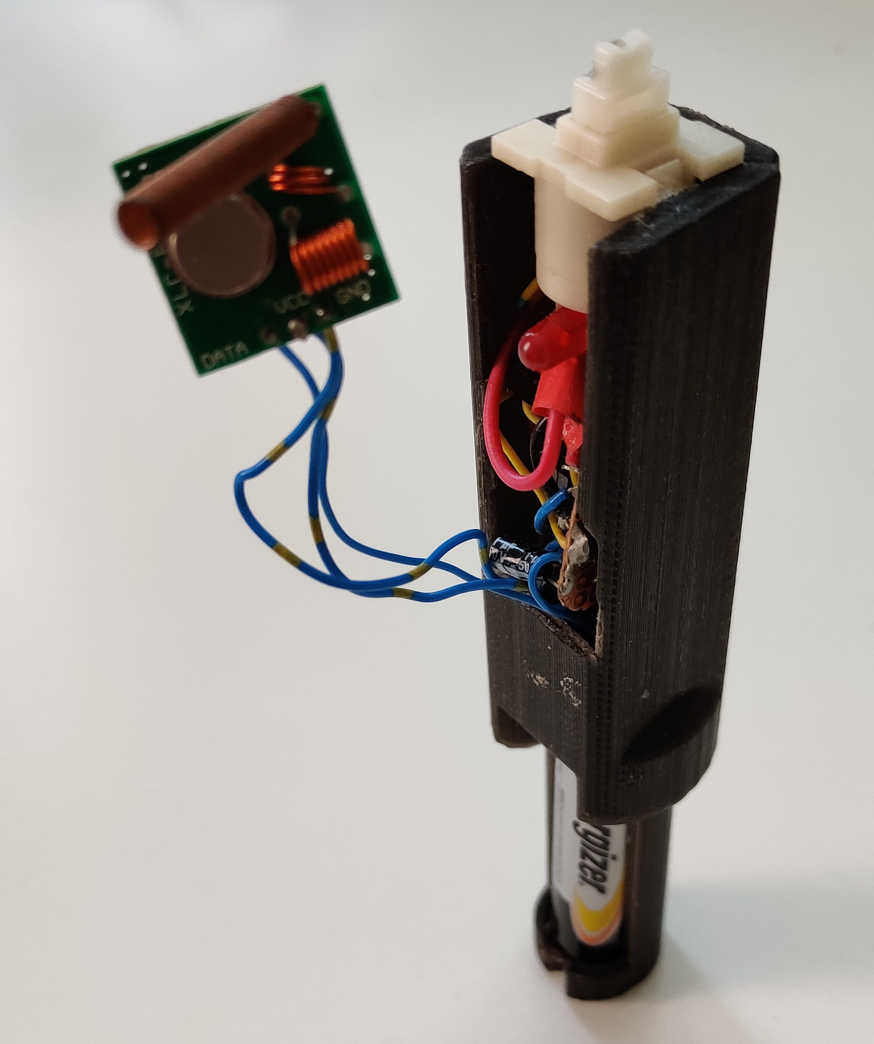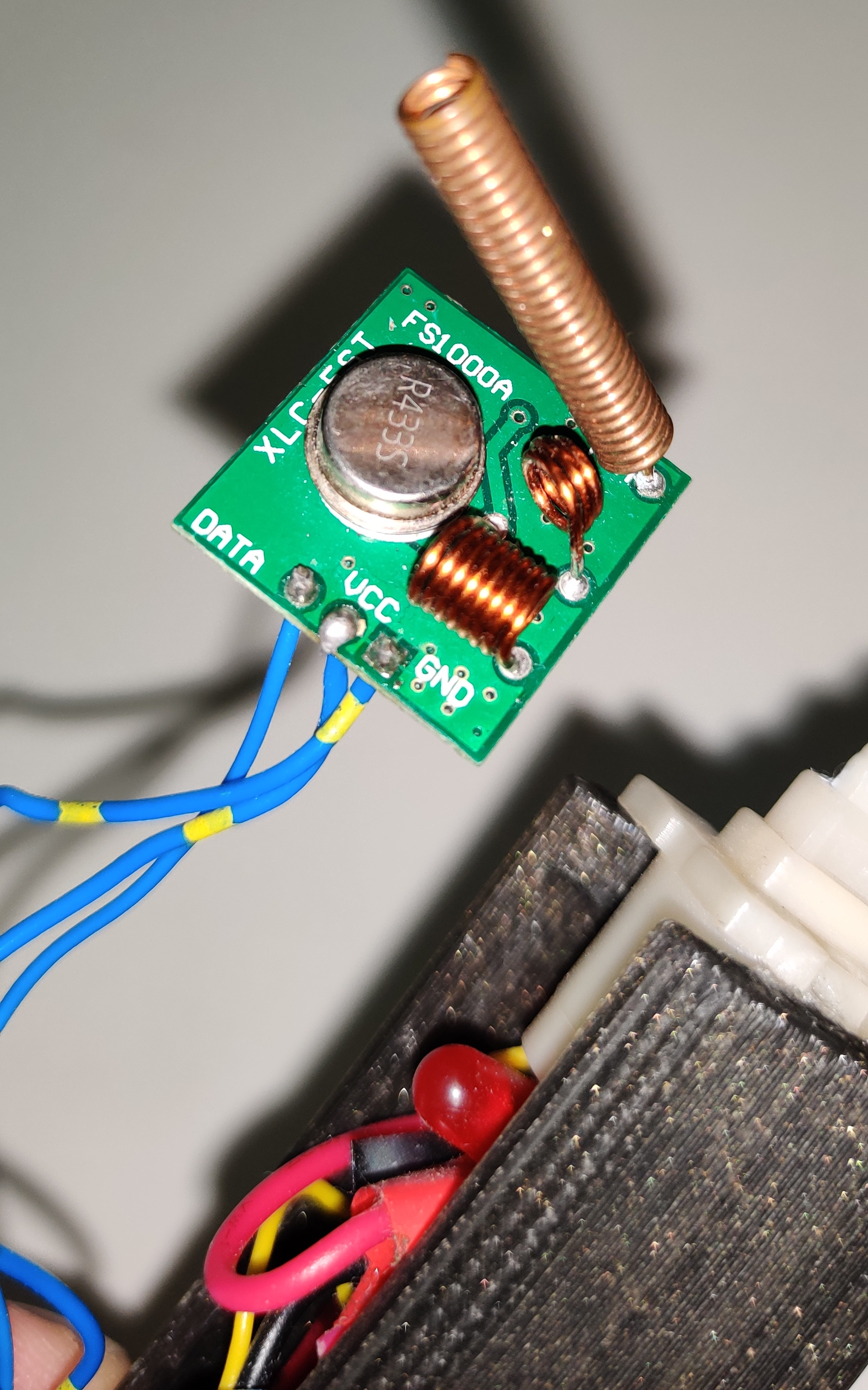 - A preassembled 433MHz radio transmitter circuit (dangling out of the front of the case to avoid interfering with the other electronics).